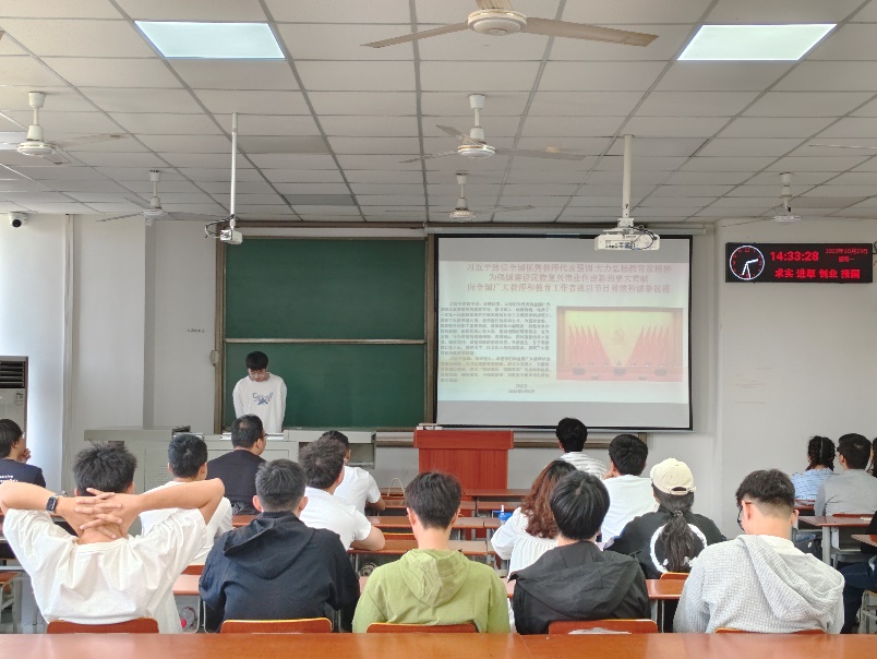 会上,宿建部的三位同学作为代表,带领大家进行理论学习,先后学习了“庆祝中华人民共和国成立74周年招待会在京举行 习近平发表重要讲话”、“《求是》杂志发表习近平总书记重要文章《扎实推动教育强国建设》”以及“习近平致信全国优秀教师代表强调强调大力弘扬教育家精神,为强国建设民族复兴伟业作出新的更大贡献,向全国国广大教师和教育工作者致以节日问候和诚挚祝福”主要内容。随后,刘超群主席就推动教育强国建设这一主题,组织成员们开展主题研讨。