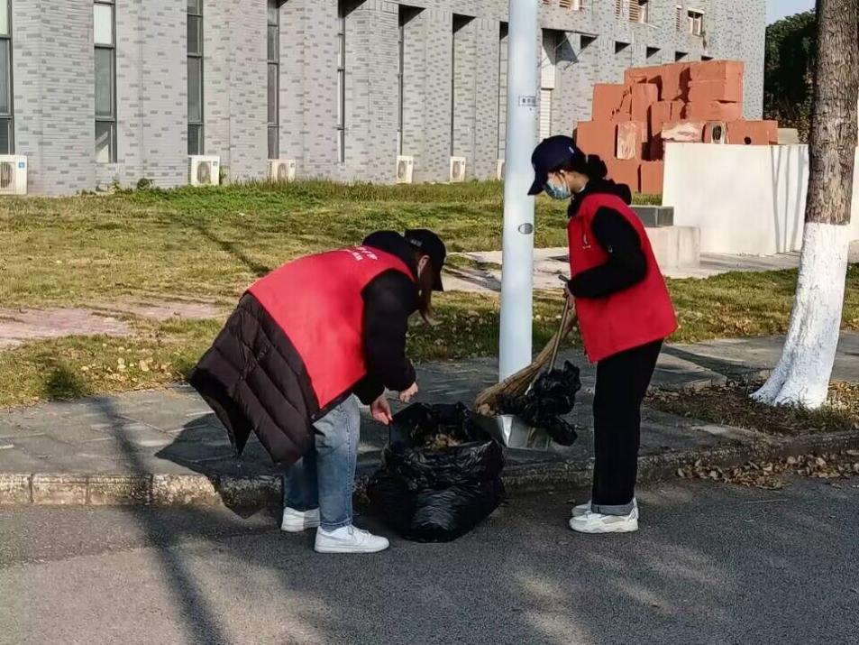 下午两点,志愿者们早早地到达集合地点拿好劳动工具,跟随清洁阿姨的脚步有序前往知音路、子期路等学校主干道进行落叶清扫。在“师傅们”的耐心指导下,大家很快掌握了清扫落叶的要领,大家分工明确,密切合作,有的同学用扫帚收拢落叶,有的同学撑起编织袋,还有的同学徒手将树叶捧装到编织袋里。大家挽起袖子齐动手,既认真又细心,两个小时过后,原本布满落叶的路面焕然一新。