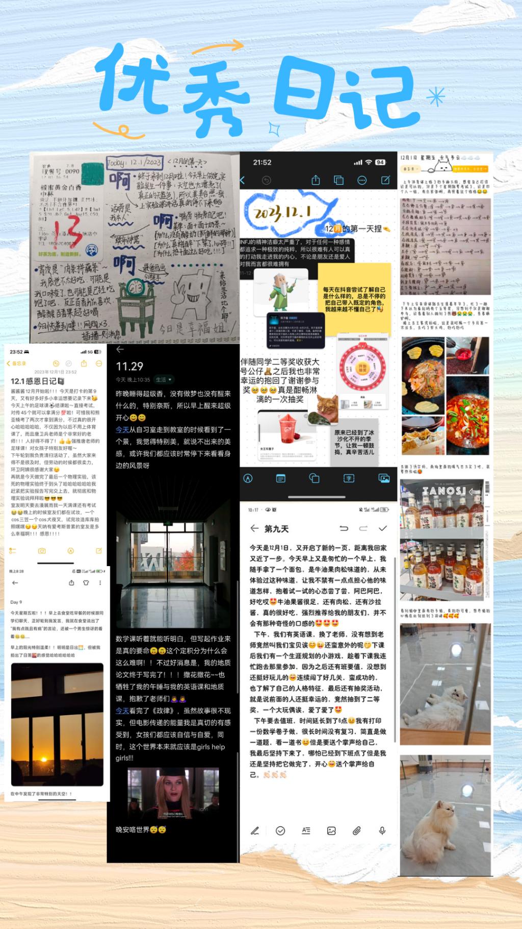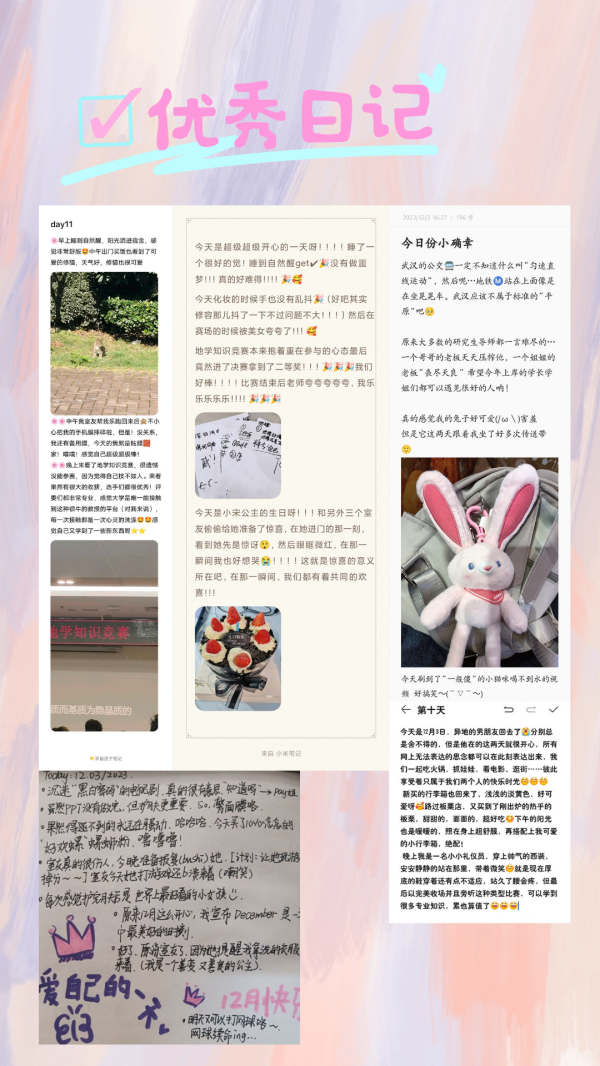 学生会心育部成员通过在活动前入班宣讲,吸引同学了解和参与。百余名同学每天通过 QQ 群的打卡链接,积极分享身边有爱的同伴、暖心的事物、感动的时刻。例如地信22302班文木燕同学在 11 月 28 日的感恩日记中写到“今天是小宋公主的生日!和另外三个室友偷偷给她准备了惊喜,在她进门的那一刻。看到她先是惊讶,然后眼眶微红,在那一瞬间我也好想哭,这就是惊喜的意义!”令人心里一暖。每晚心育部负责人提醒、完成收集后,会选出优秀日记,并于次日公布名单并制成电子海报分享在QQ群,鼓励同学们继续努力“晒幸福”。