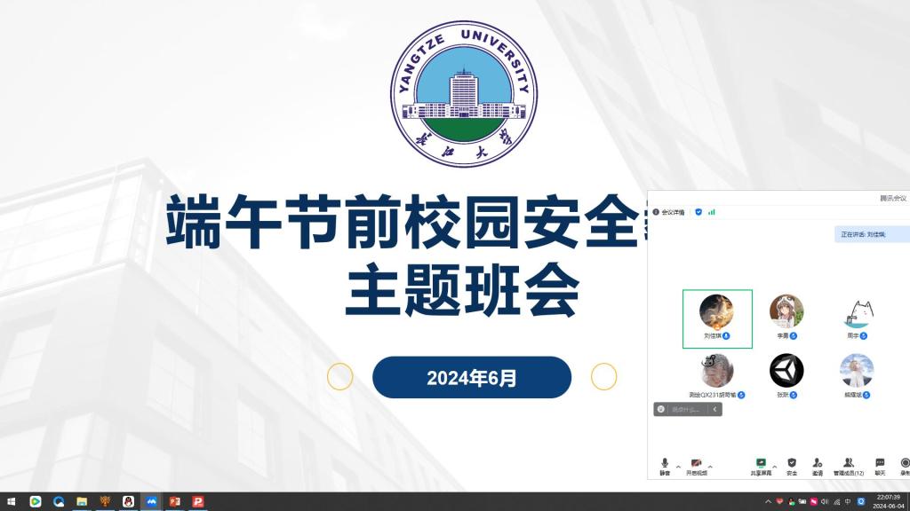 于6月4日组织全院本研究生召开端午节假期安全教育主题班会,以线上线下相结合的方式,由班主任或班委召开端午节假期安全教育主题班会,全面收集学生离校去向、时间及行程安排。