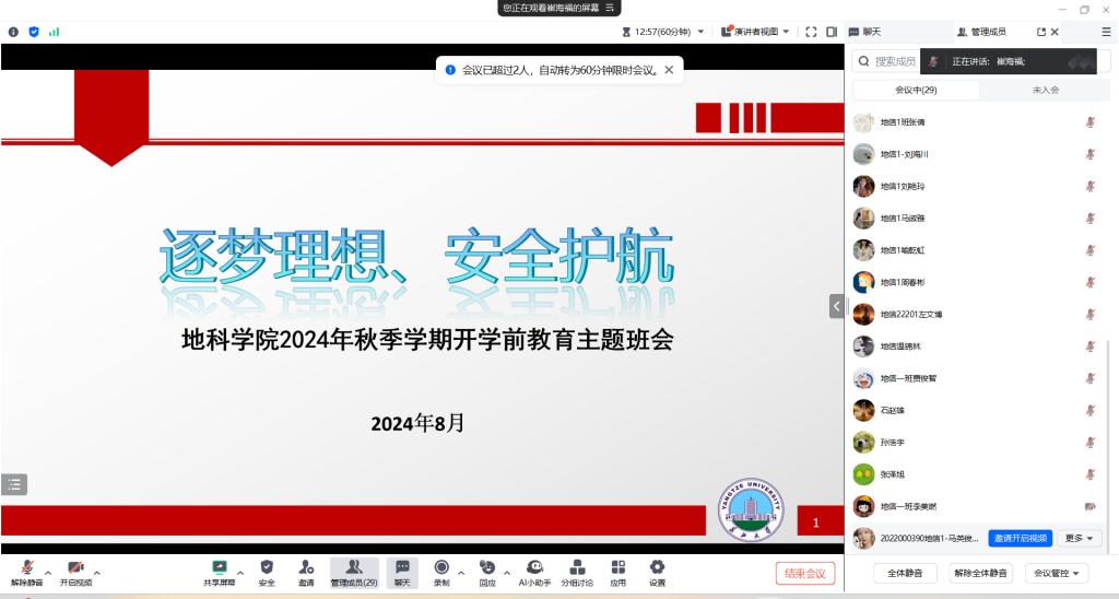 会上,辅导员、班主任老师向同学们传达了学校关于开学前期间的相关工作及管理规定,进行了学生关于消防、交通、人身、财产安全,防诈骗、溺水、校园欺凌、毒品等的来校前安全教育。同时根据不同年级阶段特点,分别开展了考研情绪疏导、考研择校指导、生涯规划等教育。