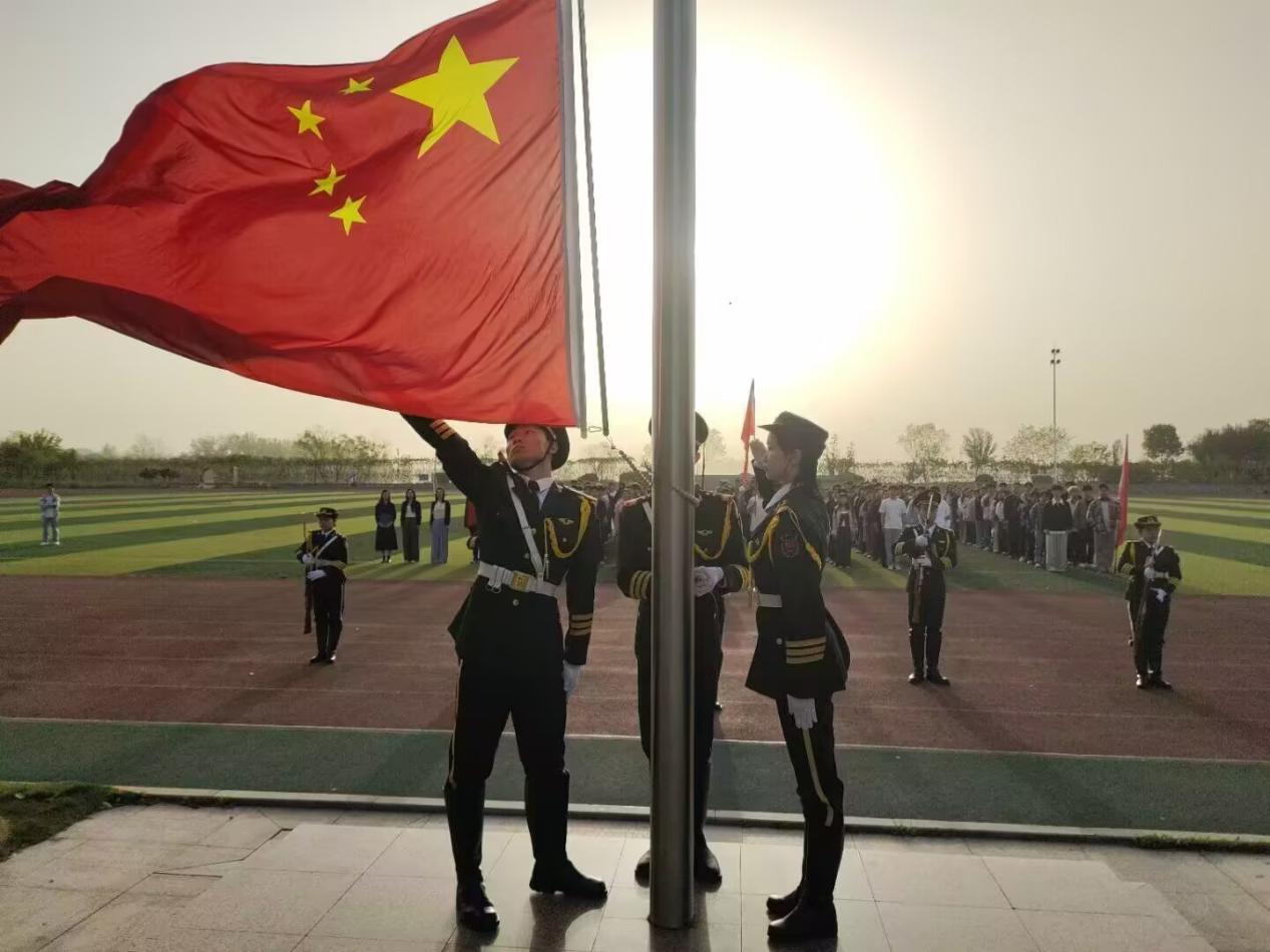 朝阳的光辉浸染了整个操场,整齐列队的师生们身姿挺拔,眼中闪烁着期待的光芒,共同迎接升旗仪式。在庄严的国歌声中,鲜艳的五星红旗冉冉升起,迎风飘扬的旗帜仿佛在诉说着青春的使命与担当。