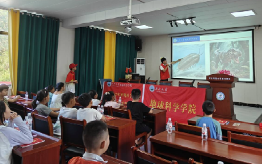 在地质知识的海洋中,孩子们尽情遨游。当看到古生物复原图时,孩子们兴奋不已,眼中满是对未知世界的好奇与渴望,踊跃提问。“马蹄蟹的血液为什么是蓝色的?”“三叶虫是什么时候出现的?”“地球上最大的古生物是什么?”志愿者老师对问题一一做了解答。
