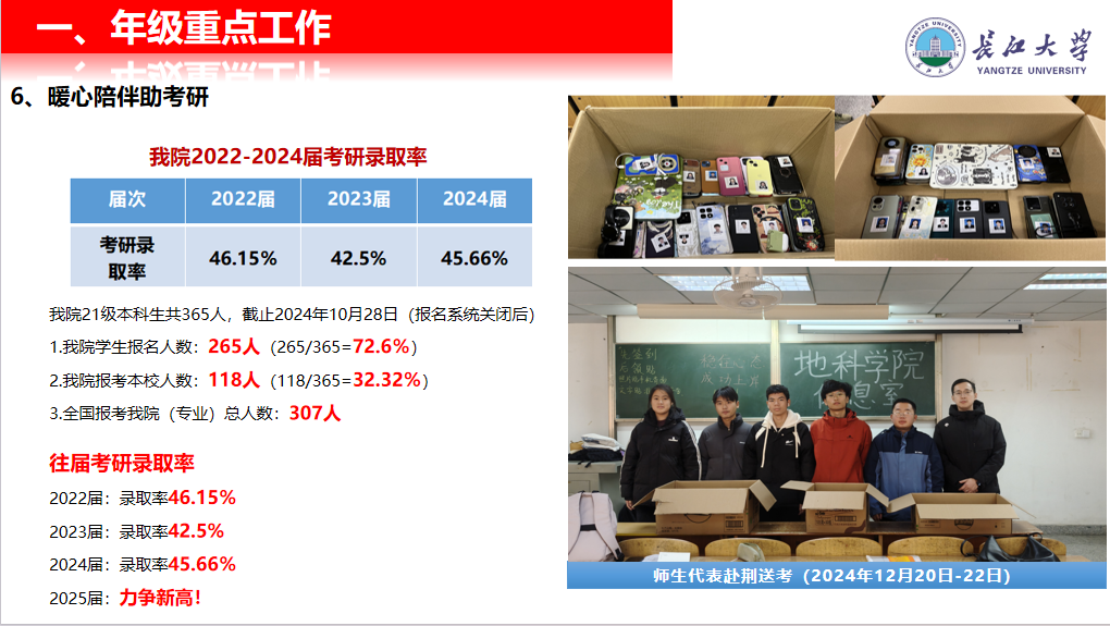 详细介绍了近年考研趋势、院内资源支持及重要时间节点,并展示了师生赴荆送考、考研送温暖等暖心举措,体现全程陪伴的育人理念。