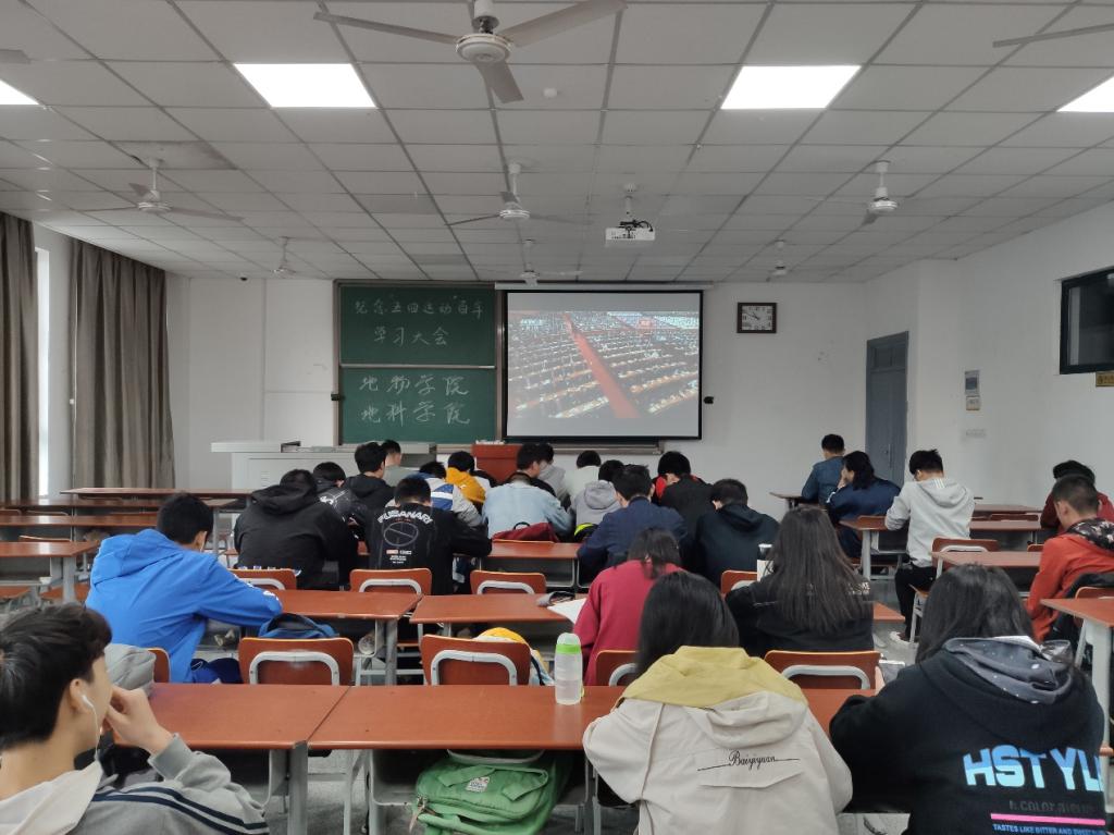 青年团员于A-106观看在人民大会堂召开的“纪念五四运动100周年大会”直播,学习习近平总书记重要讲话。