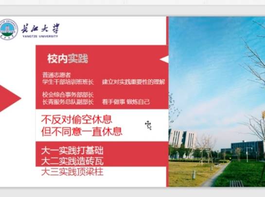 29日晚7点由黄东谋、程亮、罗慈航3位优秀毕业生为地质系的大一同学分享经验。程亮主要介绍了认识大学、改善学习环境、认识自己、改造自己这四个方面,为大家讲述了如何在大学期间里正确快捷的改善自己、提升自己。罗慈航为大家介绍了他在备考英语四六级时的方法,以一个学长的经验为我们讲述了英语基础的重要性,尤其是想一次通过英语等级考试的同学,更应该注重基础,在考试中有效分配答题时间。黄东谋的分享谈到了在学校学习、考研学习和娱乐活动三个场景。提到有效提高上课学习效率的方法——坐在第一排,第一排位置的优势在于能够和老师互动、能听得更加清晰、减少分神的机会。同时,也提到大学生活中广交良友、培养良好的兴趣爱好对未来生活的益处。