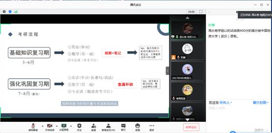 于2020年6月11日-14日,分别邀请瞿芳芳、金澳涵、周郑鹏等8位2016级优秀考研学子,分地信专业、地质专业、资工专业3个专场,在腾讯会议上开展线上考研经验交流。