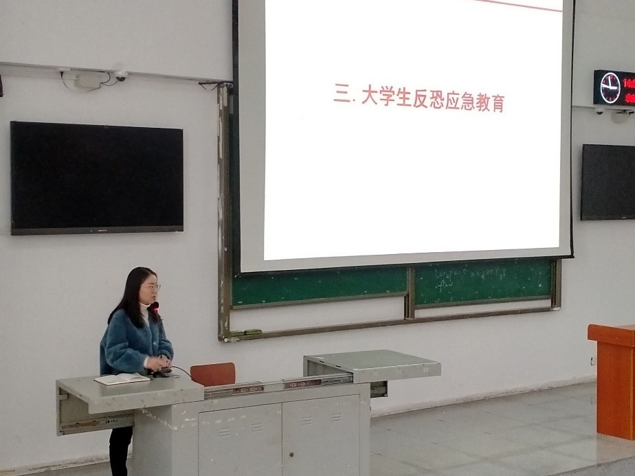 首先,郭霖老师从防范毒品、防范艾滋病和反恐应急教育三个主题向同学们进行安全宣讲。郭老师着重强调了毒品的危害:毁灭自己、祸及家庭、危害社会,提醒同学们要从心理、行为和思想上树立牢固防线。郭老师还给同学们详细讲解了艾滋病的传播途径与预防措施,以及遇到恐怖袭击事件时的基本自救方法。