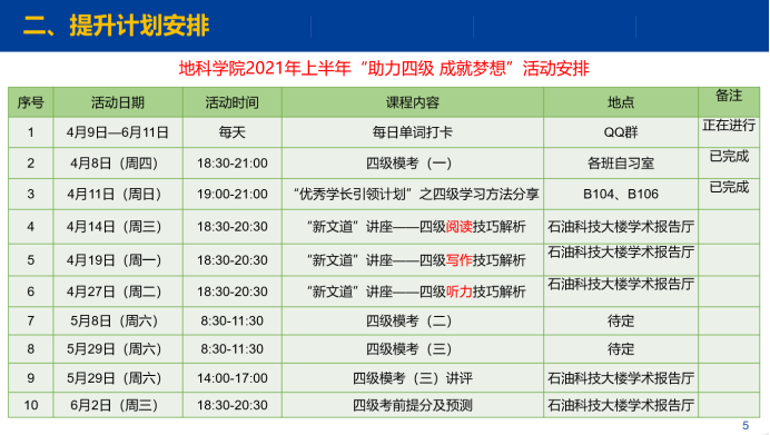 为大家精心制定的“助力四级 成就梦想”系列活动安排,倡议以班为单位建立学习小组,分班制定学习计划并落实。她鼓励同学们珍惜每次学习机会,用“坚持”与“高效”备战英语四级。