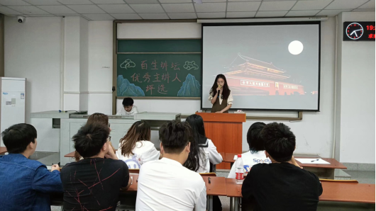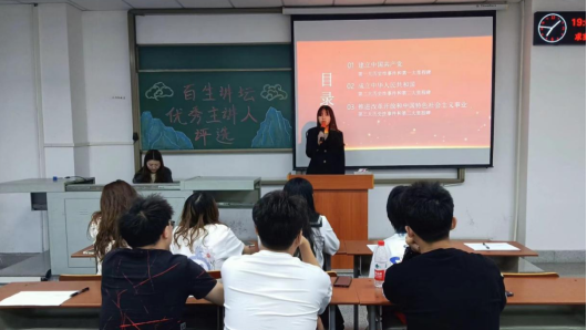 于5月5日晚7时在A教306开展以“青春心向党,建功新时代”为主题的百生讲坛活动。此次活动由团委学生会主席郑娜主持,学生会全体部长参与此次活动。