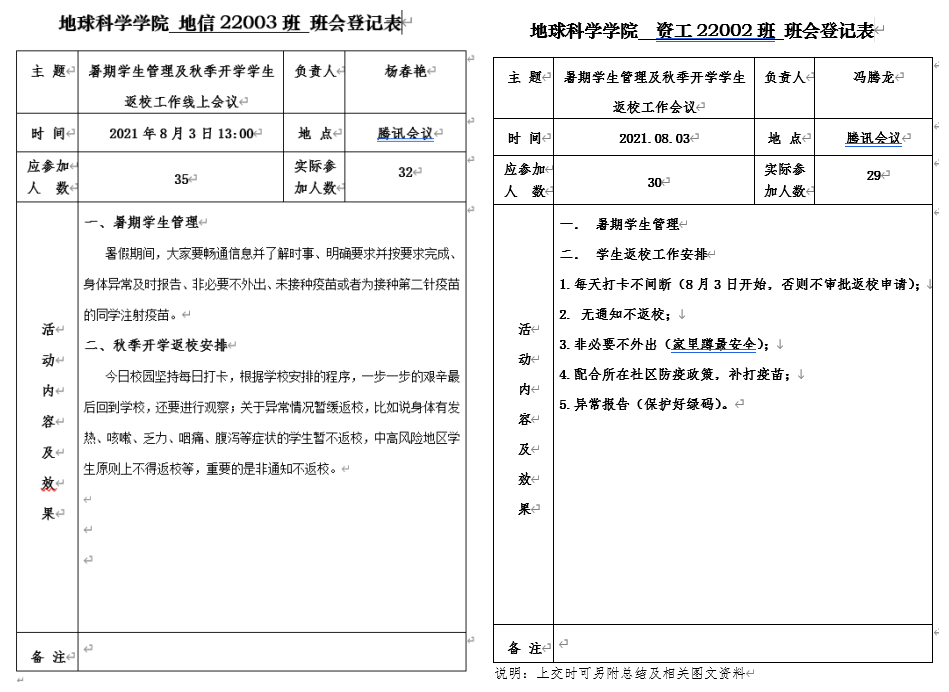 各年级辅导员按“校内”与“校外”两类学生分组组织召开主题班会。会议内容主要包括暑假学生管理和秋季开学返校安排两方面,重点介绍了当前愈发严重的疫情防控形势,要求同学们在暑假期间保持信息的畅通、明确学校的相关要求、非必要不外出并出现问题及时报告,最后要求积极注射疫苗;接下来对返校的6个步骤逐一进行讲解,特别是对“打卡”和“申请”环节的“每天坚持打卡、提交行程绿码和健康绿码、填写返校行程”等重难点工作进行了仔细说明。