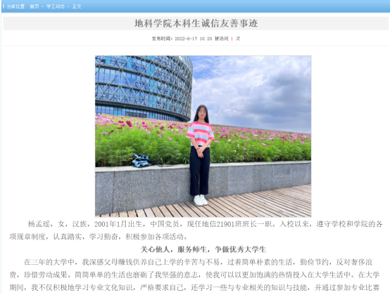 积极开展“诚实做人、诚信治学、诚信就业”的先进典型评选工作,在各年级积极组织优秀学生进行申报,选拔出杨孟瑶等4名同学为代表的诚信友善典型,通过金碧
