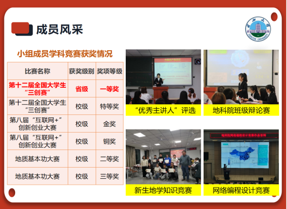 2021年12月,小组开展了两场理论学习培训,成员综合素质和团队凝聚力显著提高。今年1至3月,小组成员通过前往红色革命基地,结合十九届六中全会精神,进行党史研学,并开展了以“紧跟时代浪潮,赓续红色血脉”为主题的线下汇报与评比。为了传递研学成果,学员们在本班班团会上做了主题宣讲,受到广泛好评。本活动还受到省级媒体的关注。今年5月,学员集中观看直播,学习了习近平总书记在中国人民大学考察和建团百年重要讲话精神,并开展专题交流会,分享学习心得。今年7至9月,小组开展“学习旧足迹,奋进新征程”暑期实践活动,通过走访、查阅资料等方式,对党的十八大以来习近平总书记重要工作足迹进行学习,并制作学习视频,在金碧