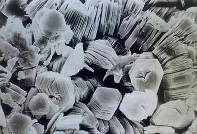 3.蒙脱石族:蒙脱石呈白色或灰白色,致密块状者呈蜡状光泽,疏松土状者光泽暗淡,硬度1-2,相对密度2-3,蒙脱石呈细鳞片状,鹅毛状,绒状等。