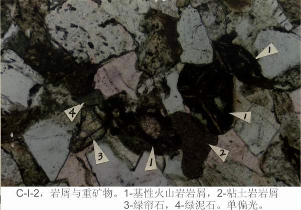 C—I—20:颗粒:石英(多具裂纹)、石英岩岩屑、燧石、粘土岩岩屑、页岩岩屑、粉砂质页岩岩屑、绿泥石片岩岩屑。
