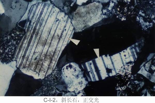 C—I—12:①颗粒:微斜长石、正长石(高岭石化)、长石(再生)。②杂基成分:粘土矿物。③胶结物成分:硅质胶结物(微晶石英)。