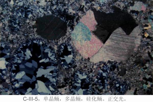 描述C—Ⅲ—28的岩石结构(不同级别晶粒的含量、矿物成分特点,指明经茜素红S盐酸溶液染色后确认的矿物成分、晶粒大小、自形程度、百分含量)。做出岩石的矿物成分定名(注意结合手标本特点观察)。