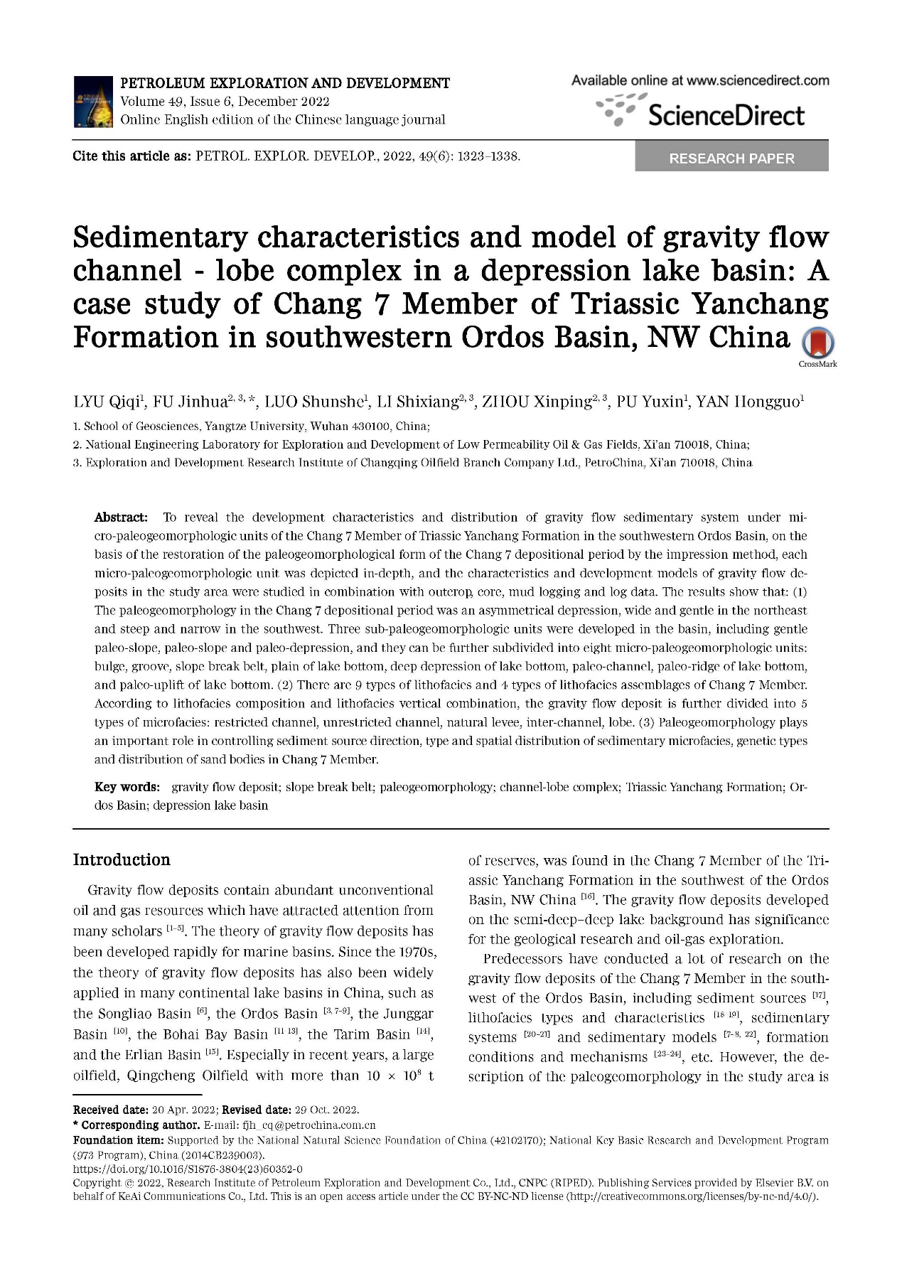 金碧娱乐场 教师吕奇奇副教授以第一作者身份在石油领域重要期刊《Petroleum Exploration and Development》发表题为《Sedimentary characteristics and model of gravity flow channel - lobe complex in a depression lake basin: A case study of Chang 7 Member of Triassic Yanchang Formation in southwestern Ordos Basin, NW China》的研究论文,该项研究得到了国家自然科学基金项目和国家重点基础研究发展计划“973”项目的资助。