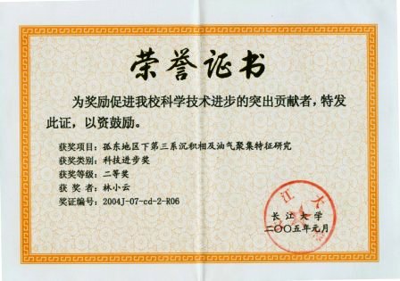 (2)“孤东地区下第三系沉积相及油气聚集特征研究”项目2004年获长江大学科技进步二等奖,排名6(奖证编号:2004J-07-cd-2-R06)。