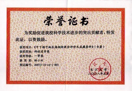 (1)《中下扬子地区海相烃源岩评价及成藏条件》专著2007年获长江大学科技进步一等奖,排名1(奖证编号:2007J-19-cd-1-R01)。