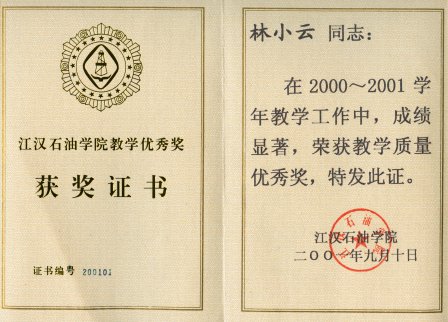 教学质量优秀奖。2005~2006、2007~2008学年获长江大学教学质量优秀奖。