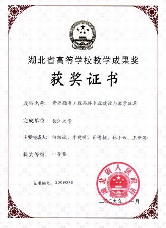 (4)“资源勘查工程品牌专业建设与教学改革”获2008年长江大学教学成果特等奖(排名4)(证书编号:2008002)、2009年湖北省教学成果一等奖(排名4)(证书编号:2009076)。