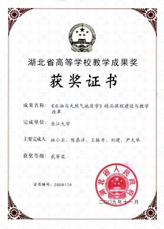(2)主持的“《石油与天然气地质学》精品课程建设与教学改革”获2008年长江大学教学成果一等奖(证书编号:2008019)、2009年湖北省教学成果二等奖(证书编号:2009174)。