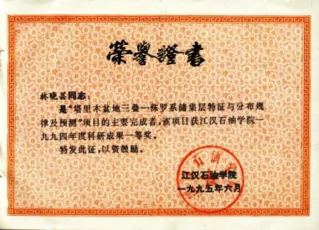 (5)“塔里木盆地三叠、侏罗系储集层特征与分布规律及预测” 国家“八五”攻关项目1994年获江汉石油金碧