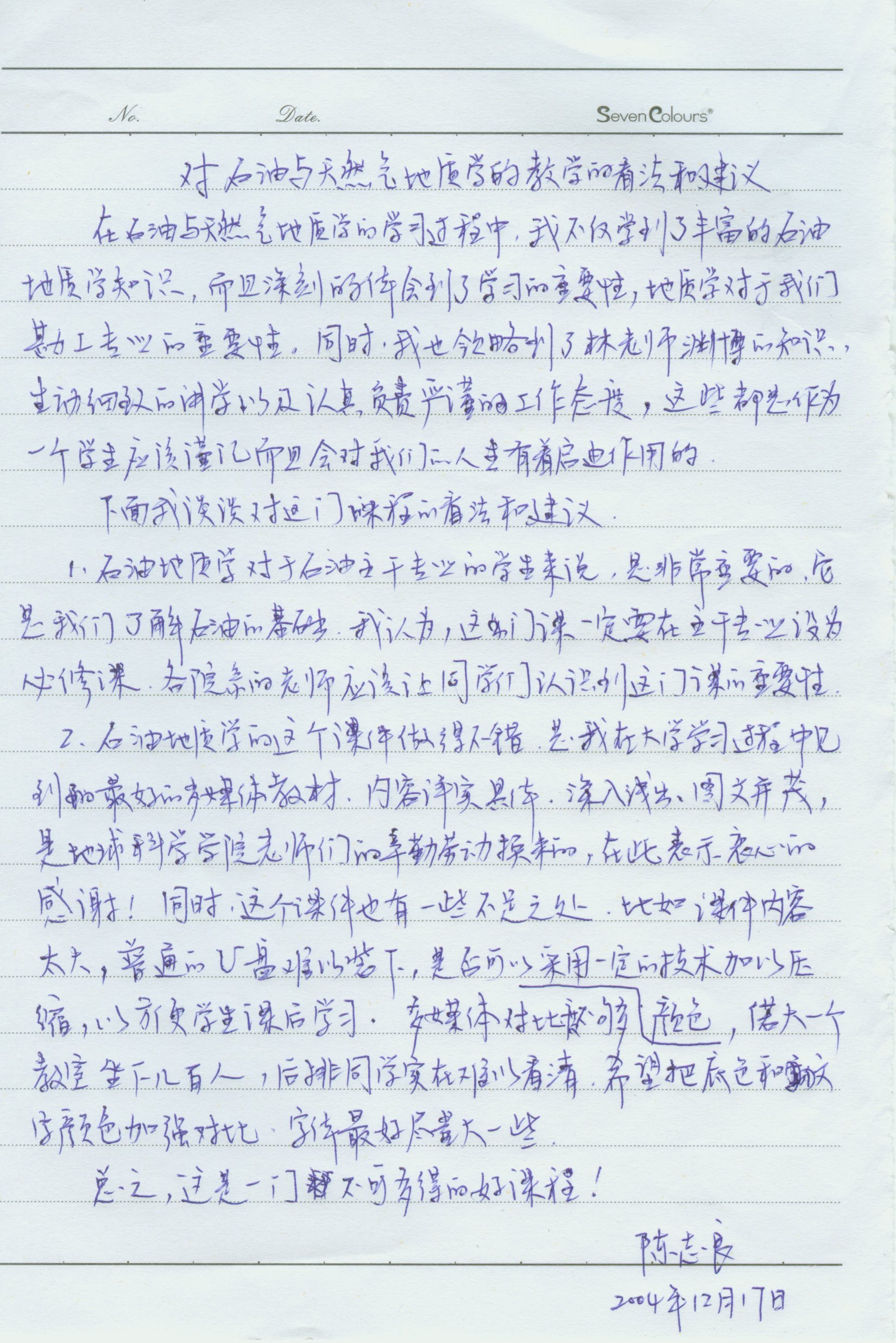 该课程近五年学生及同行对主讲教师讲课的评估值高出全校平均值,在全校教师排名中位居前列。学生对教师课堂教学评估分近五年平均为91.8。该课程作为矿产普查与勘探专业研究生入学考试的必考课程,学生参加研究生入学考试时成绩以及用人单位的反馈意见证明课程教学质量是优秀的。近五年本科生参加硕士研究生考试中,《石油地质学》专业课成绩平均优良,考研上线率高,资源勘查工程专业2001届学生考研上线率达43.3%;2002届学生考研上线率达64%;2003届学生考研上线率达53%;2004届学生考研上线率达50%; 2005届学生考研上线率达49%。学生报考的院校包括北京大学、石油大学、中国地质大学、同济大学、伦敦人名汇