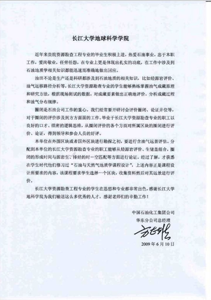 近年来贵院资源勘查工程专业的毕业生积极上进,热爱石油事业,忠于本职工作,爱岗敬业,任劳任怨,在专业上更是体现出扎实的功底,在工作中涉及到石油地质学相关知识都能迅速而准确地作出回应。长江大学资源勘查工程专业的学生在思想和专业都非常出色,感谢长江大学金碧娱乐场